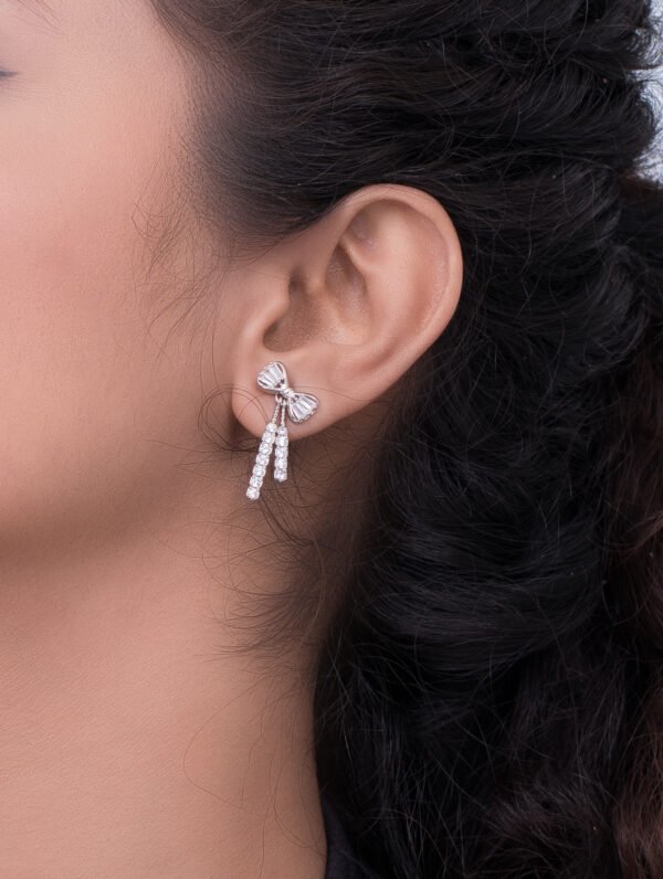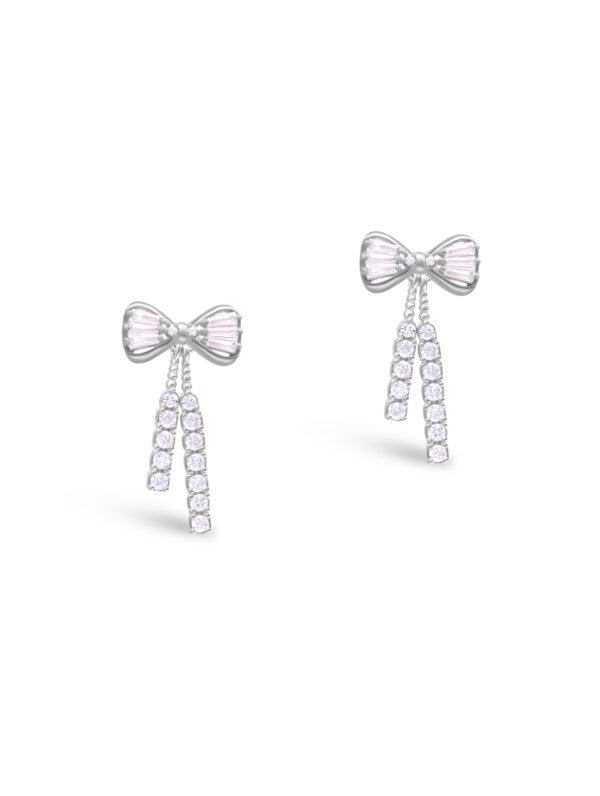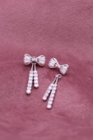 These stunning earrings are available in both rosegold and silver polish, each showcasing a captivating bow design complemented by elegant two-line hangings. The bow design is separatable, allowing you to wear it alone for a different look.