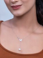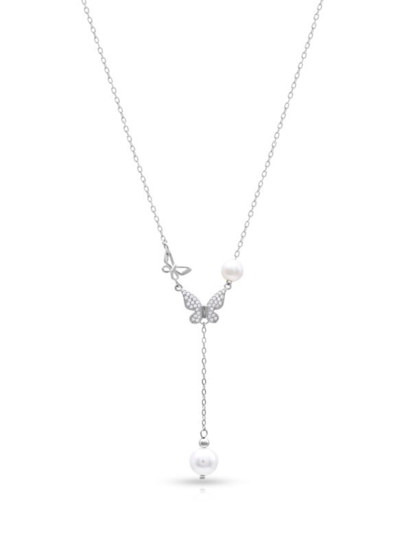 Add a touch of whimsy and elegance to your look with our sterling silver butterfly chain featuring a delicate pearl drop. This enchanting piece beautifully combines the grace of a butterfly with the timeless sophistication of a pearl, making it a perfect accessory for any occasion.