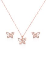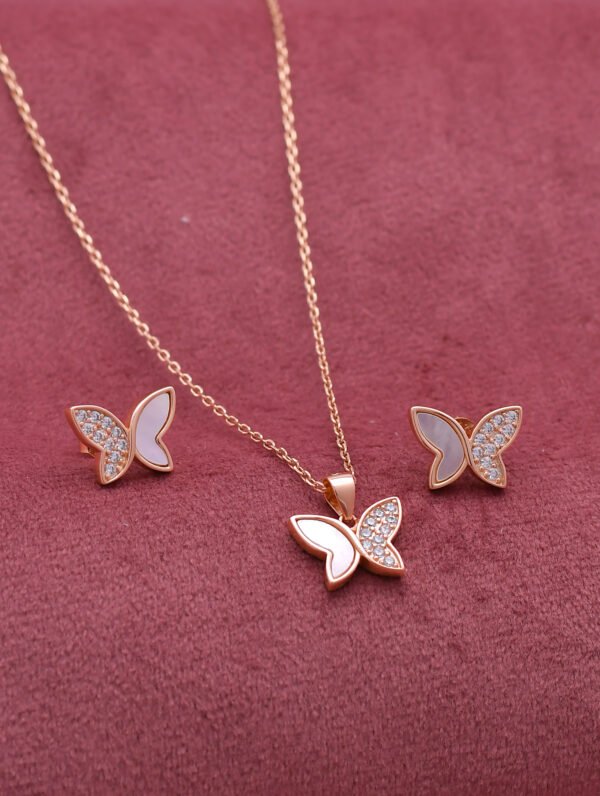 This Pendant Set With Butterfly Shape Pendant And Earring Is A Piece Of Jewelry That Add A Touch Of Glamour To Their Outfit. It Is Coated With white enamelling And Zircon At The Edges Suitable For Both Casual And Formal Occasions.