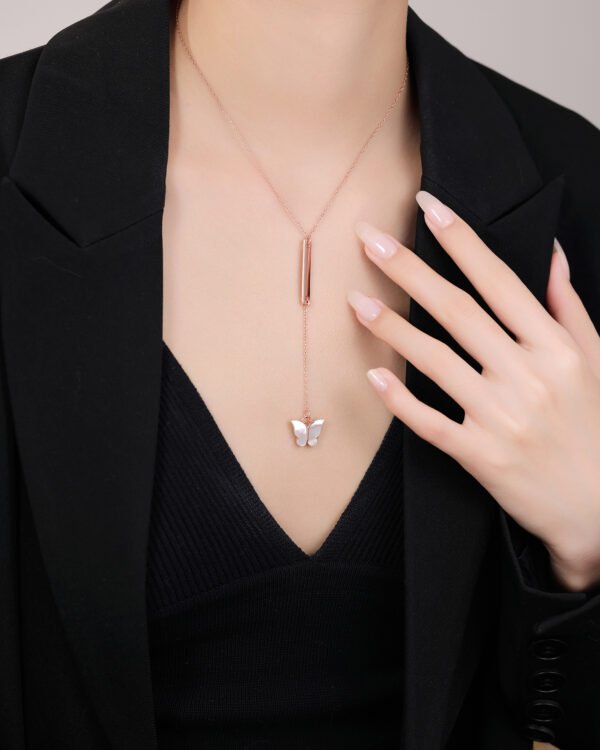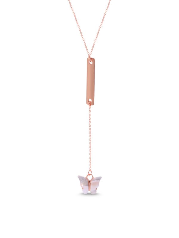 A rose gold sleek chain with a mother of pearl (MOP) butterfly pendant adds a whimsical and feminine touch to the overall look. This type of chains would be versatile enough to wear with both casual and formal outfits, making it a lovely addition to any jewelry collection.