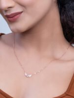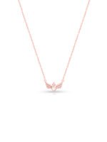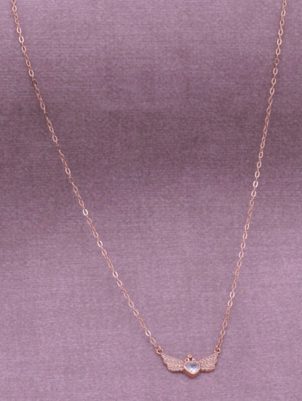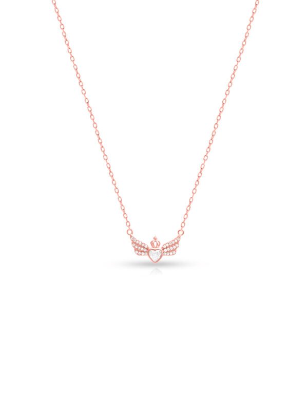 A sterling silver chain featuring a heart pendant with a solitaire in the center, crowned with a delicate crown on the top, and adorned with Swarovski crystal wings. This design combines romantic elements with a touch of regality, creating an elegant and eye-catching accessory for various occasions.